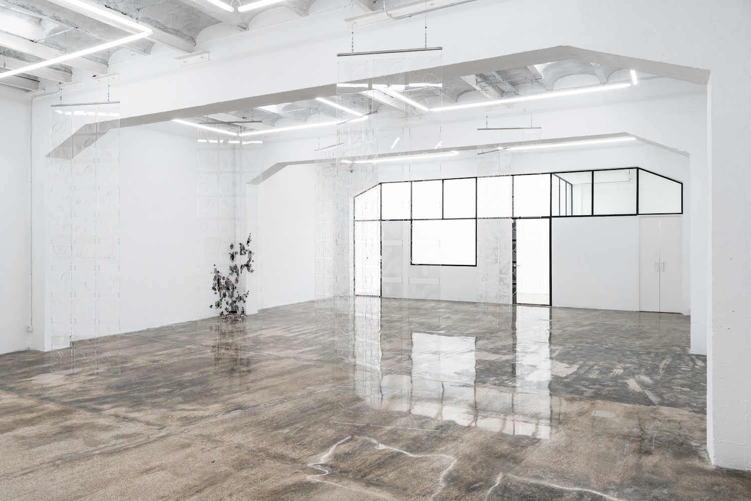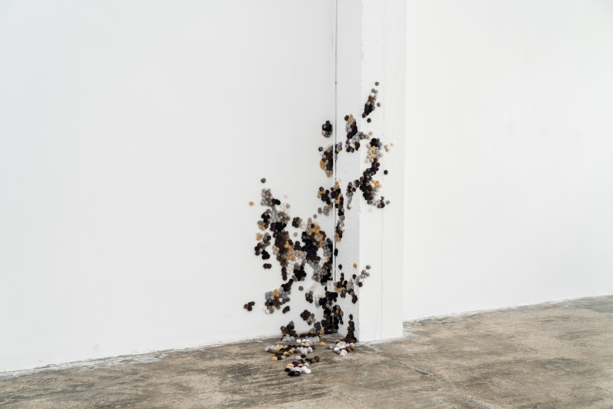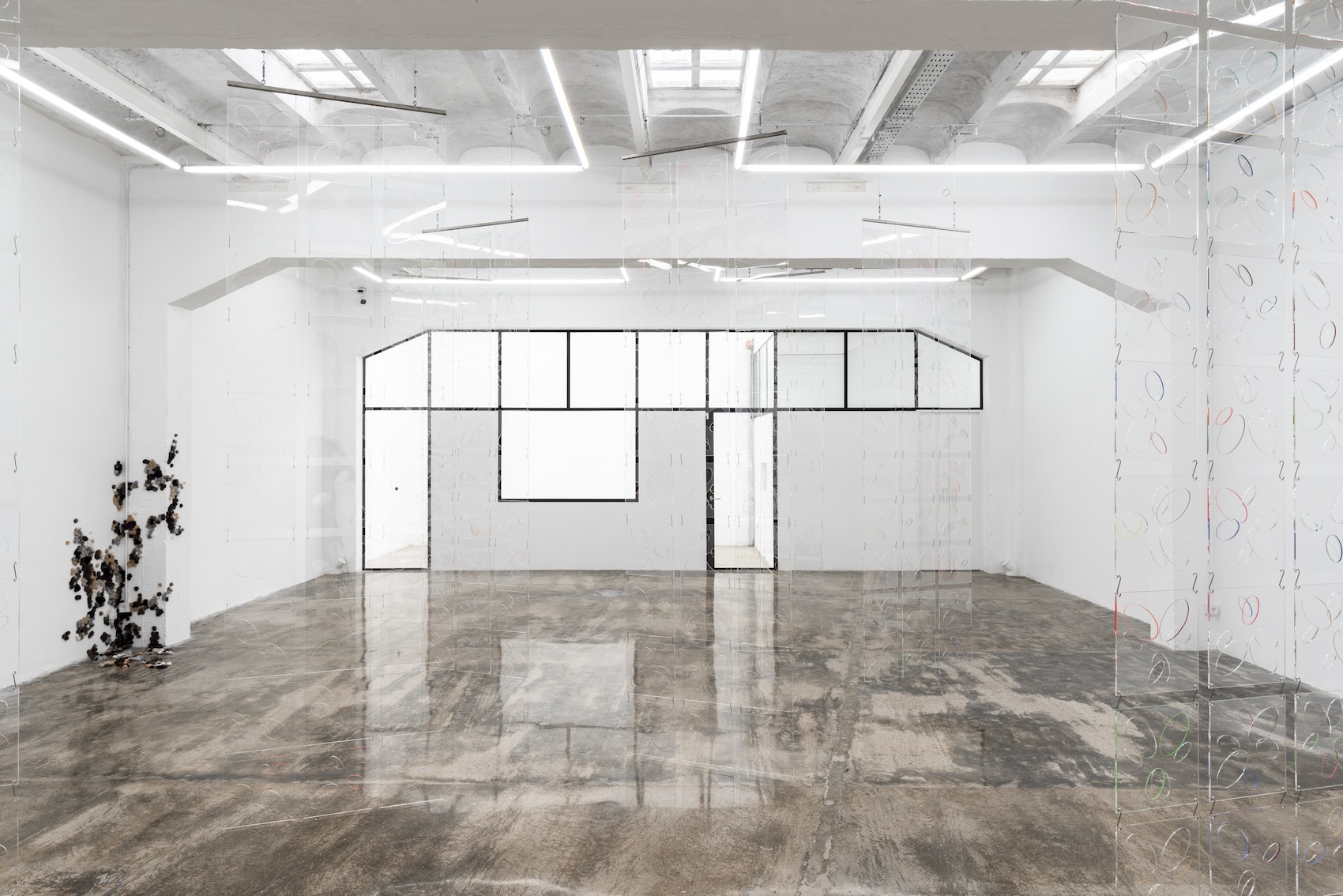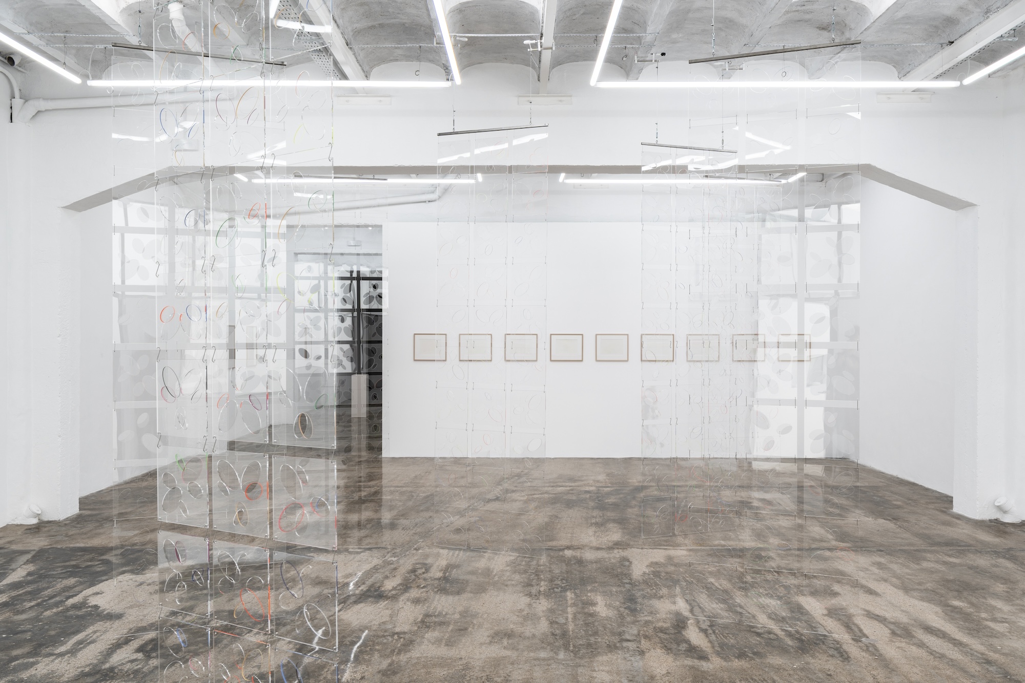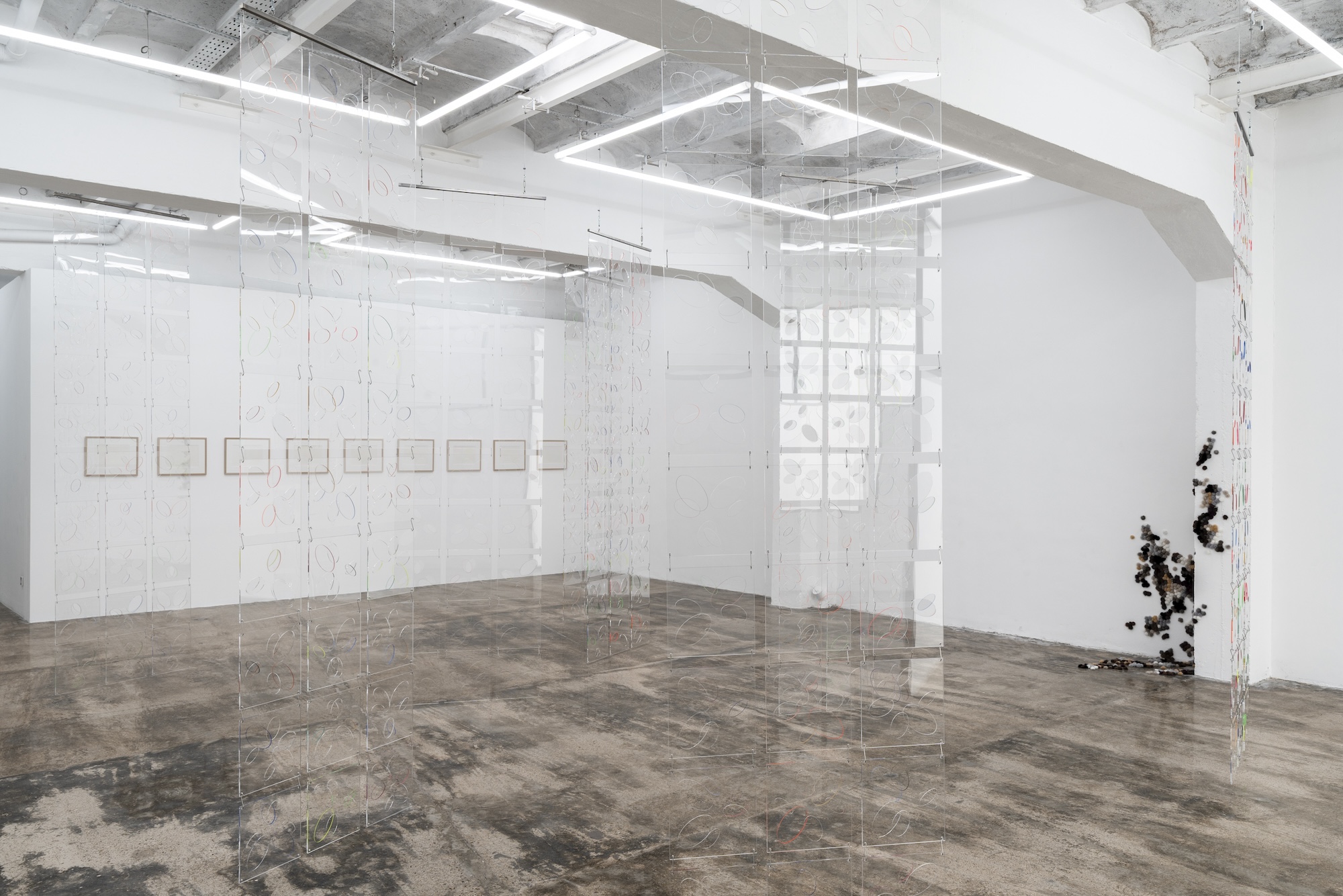 Accompanying the installation Ópalo there is the intriguing Ghost-Fuzz (2026) made out of hundreds of furry mink pompoms spreading through the floor and walls in a fashion that resembles the early-stage mould spores formation. Usually associated with decay and fast propagation, and perhaps here in sharp contrast with the utterly slow formation and stable qualities of the opal, the artists seem to poignantly refer the fragility of social and political constructs that in their precariousness can be easily eroded when certain conditions shift. If Ópalo occupies the main space of the gallery, The Ópalo (Box) (2026) is kind of its opposite version since, as its title indicates, it is contained within a box-like structure. The piece makes use of the same modular plexiglass screens that conform the large installation but this time arranged vertically, one on top of each other, including a mirror at the bottom that automatically incorporates the curious viewer into the equation. The works on paper Opal I, II, III (2026) circumscribe the motif into a two dimensional medium that once again demand us to shift our focus and the way of interpreting the image.
