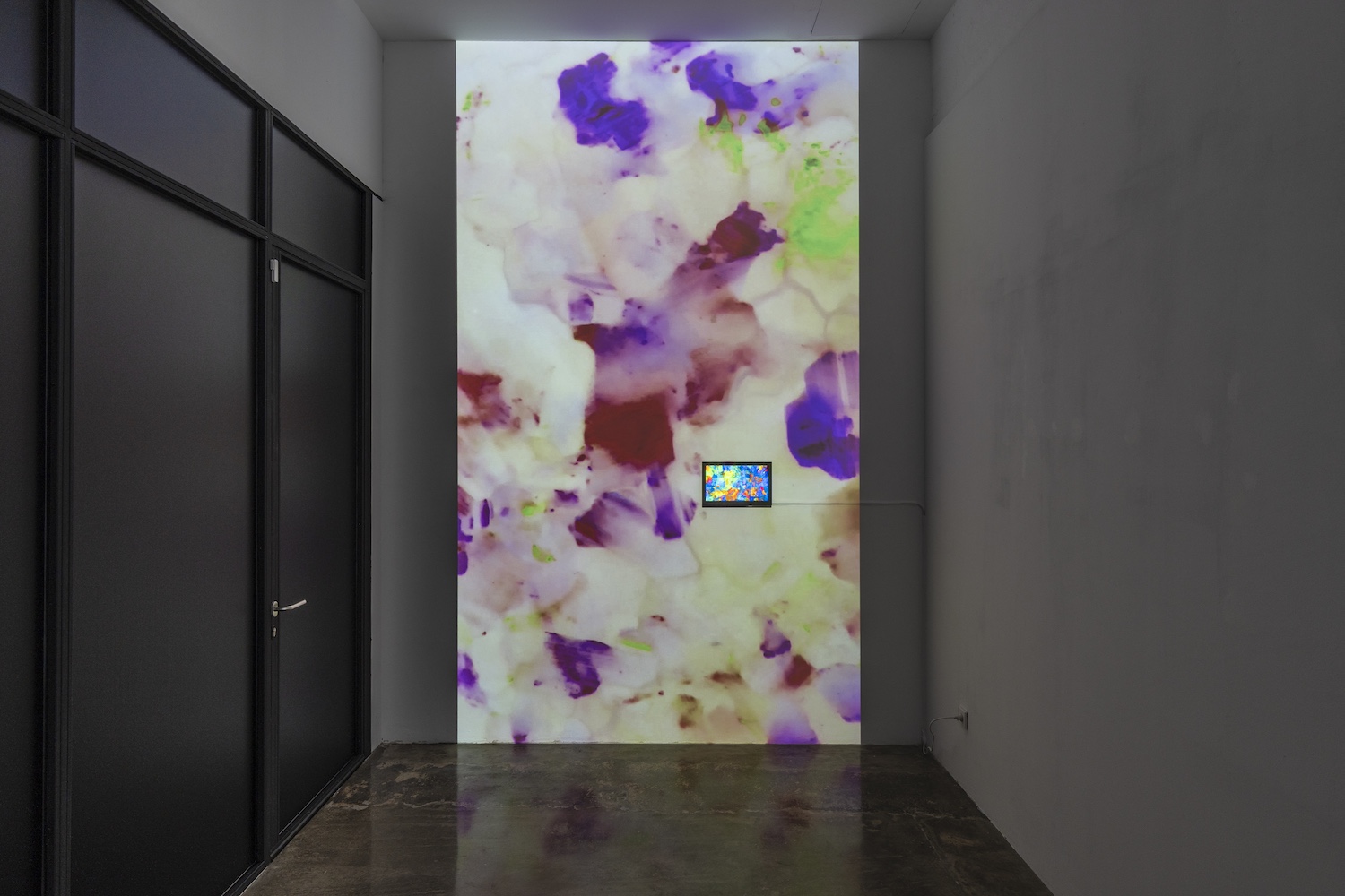 The exhibition starts with the gallery’s street glass windows completely black out thus preventing passerby’s from seeing what is indoors. Once inside, the artists invite the viewers to engage with the aforementioned thinking machine that build on their ongoing interest in perception, colour and light. In the front room there is Lumen Internum (2026), a large-scale vertical video projecting slow motion blown-up dissolving images of opals with the inverted color scheme. On top of it there is a small horizontal screen with the original video playing that very same image, which keeps pushing forward the idea of opposites and conceptual indeterminacy coexisting intertwined. The scale of the work and the powerful colour fields seem to incite the viewer to let themselves go in order to delve into the aesthetic propositions put forth by the artists.